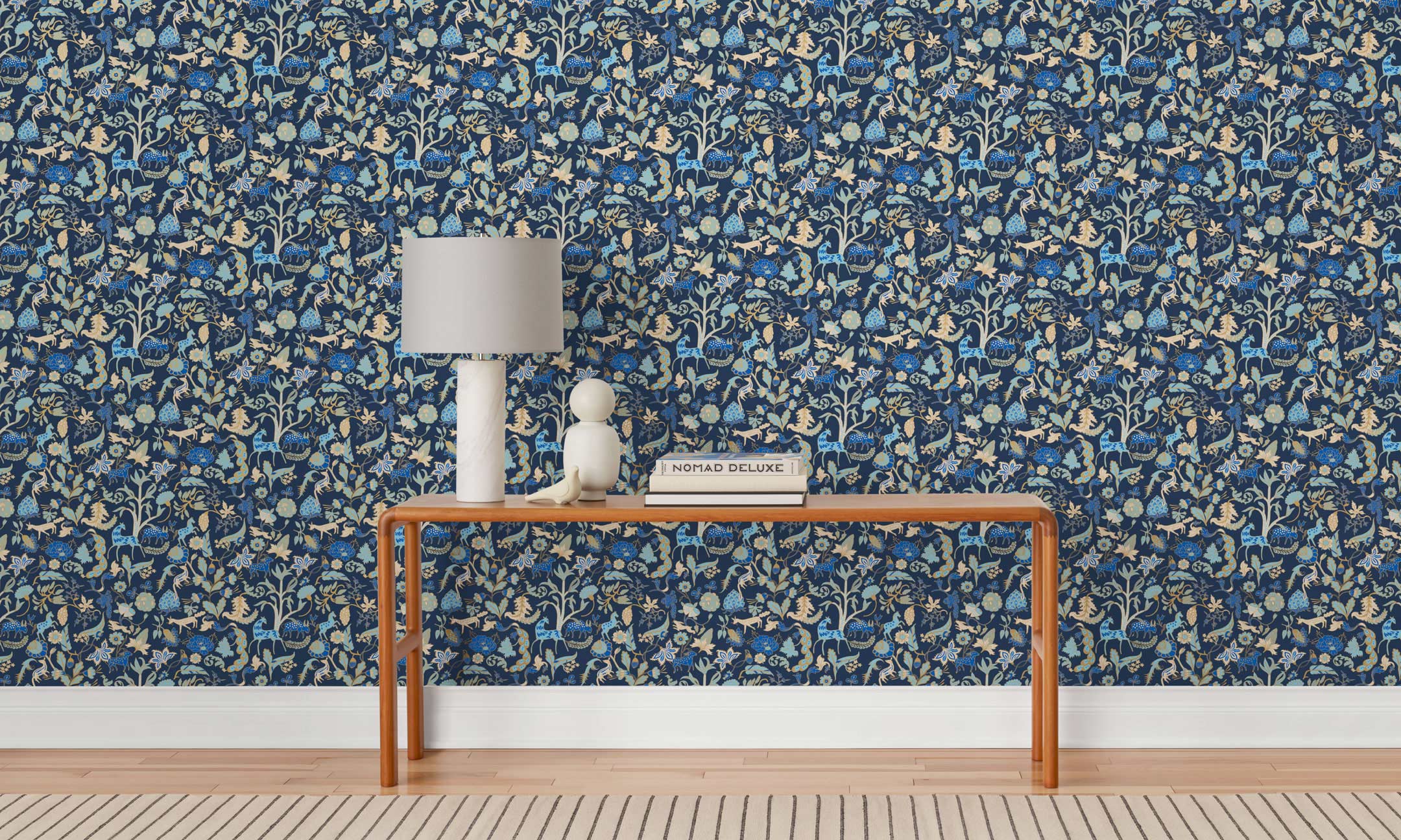 The interesting flowers, unique animals, and intricate vignettes of this pattern were inspired by 1600s Indian Chintz wallhangings, but updated for a thoroughly modern aesthetic. Designed in collaboration with Julia Rothman.