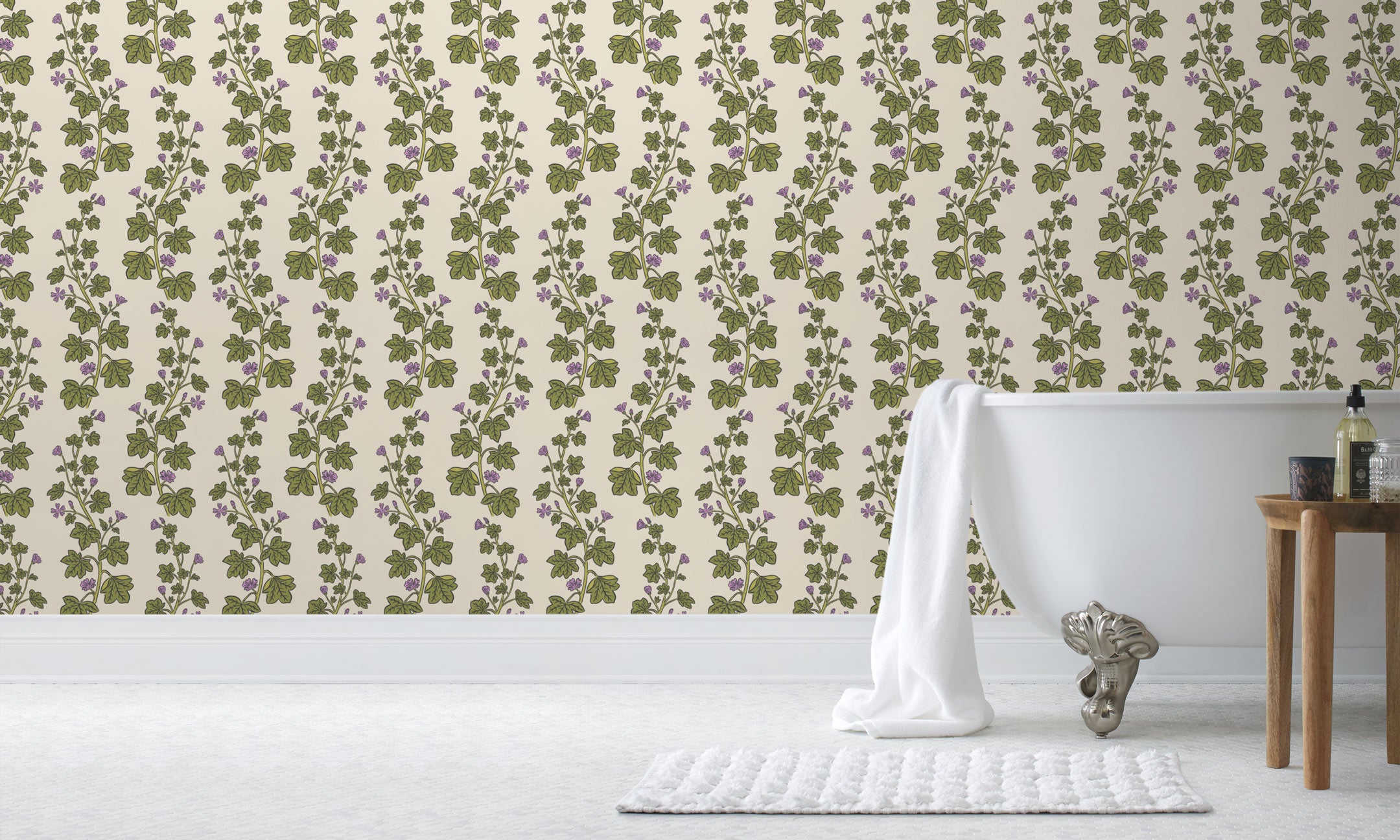 Malva draws inspiration from the Arts and Crafts movement, celebrating nature through bold, confident linework that gives form and rhythm to a climbing vine motif. Verdant foliage takes center stage, creating a pattern that feels both handcrafted and alive with organic movement–bringing structure and softness into balance.